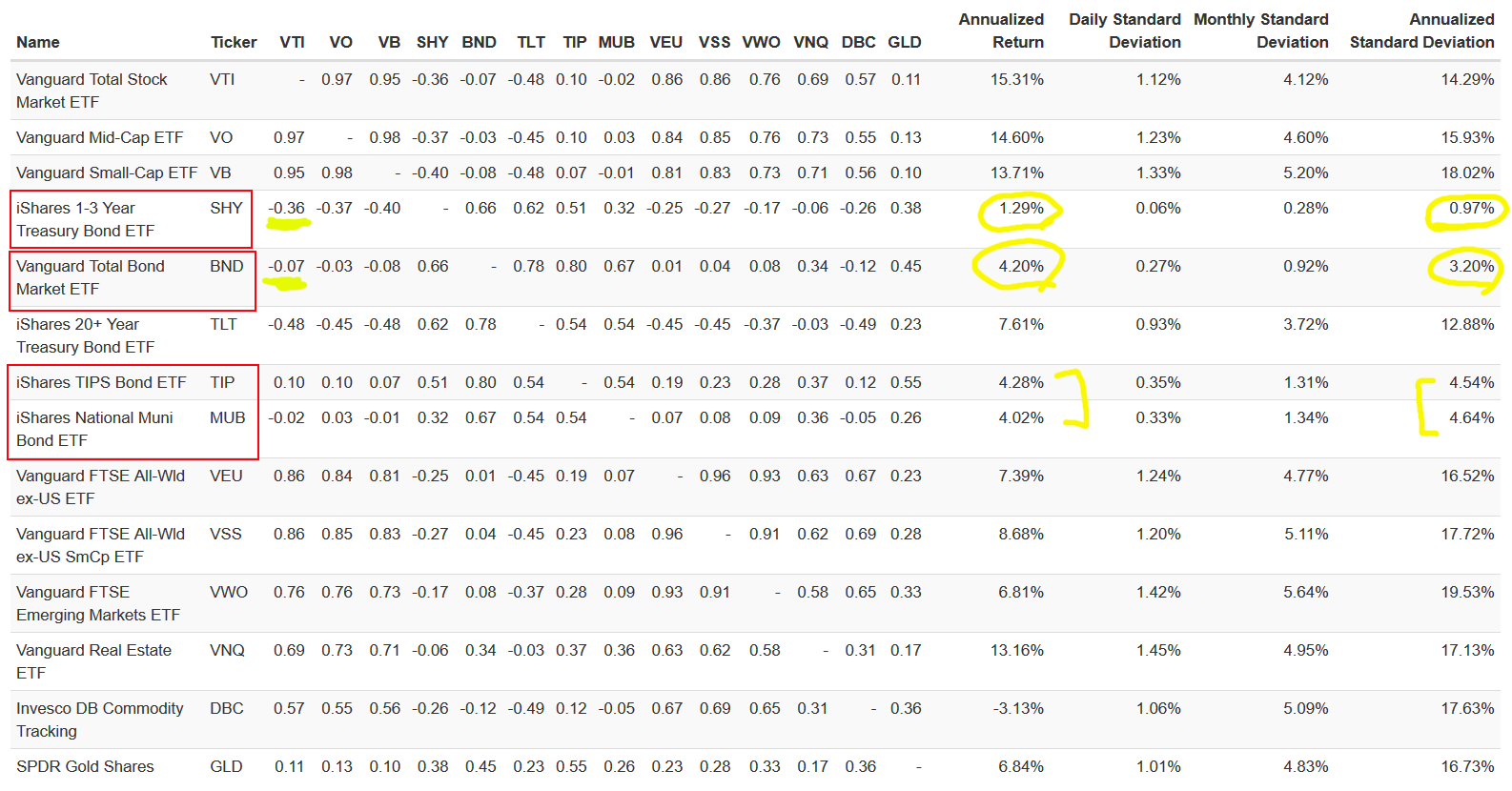 아래 표에서 필자는 BND를 비상금 통장으로 선정했습니다.