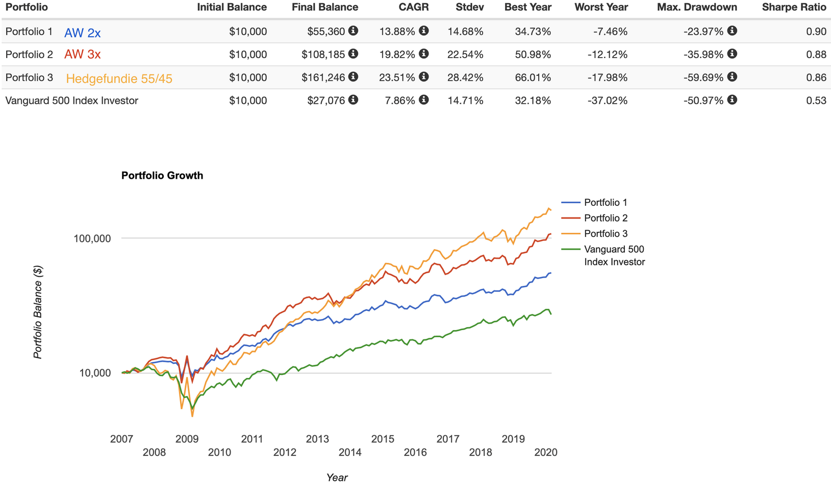 - 올웨더 2배, 3배 수익과, Hedgefundie 포트폴리오랑 비교했습니다.