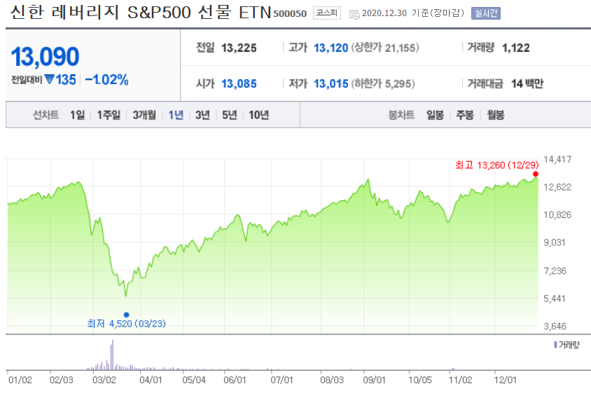 ** 신한 레버리지 S&P 선물 ETN 은 거래량이 부족하네요. 딱히 맘에 들지 않습니다.