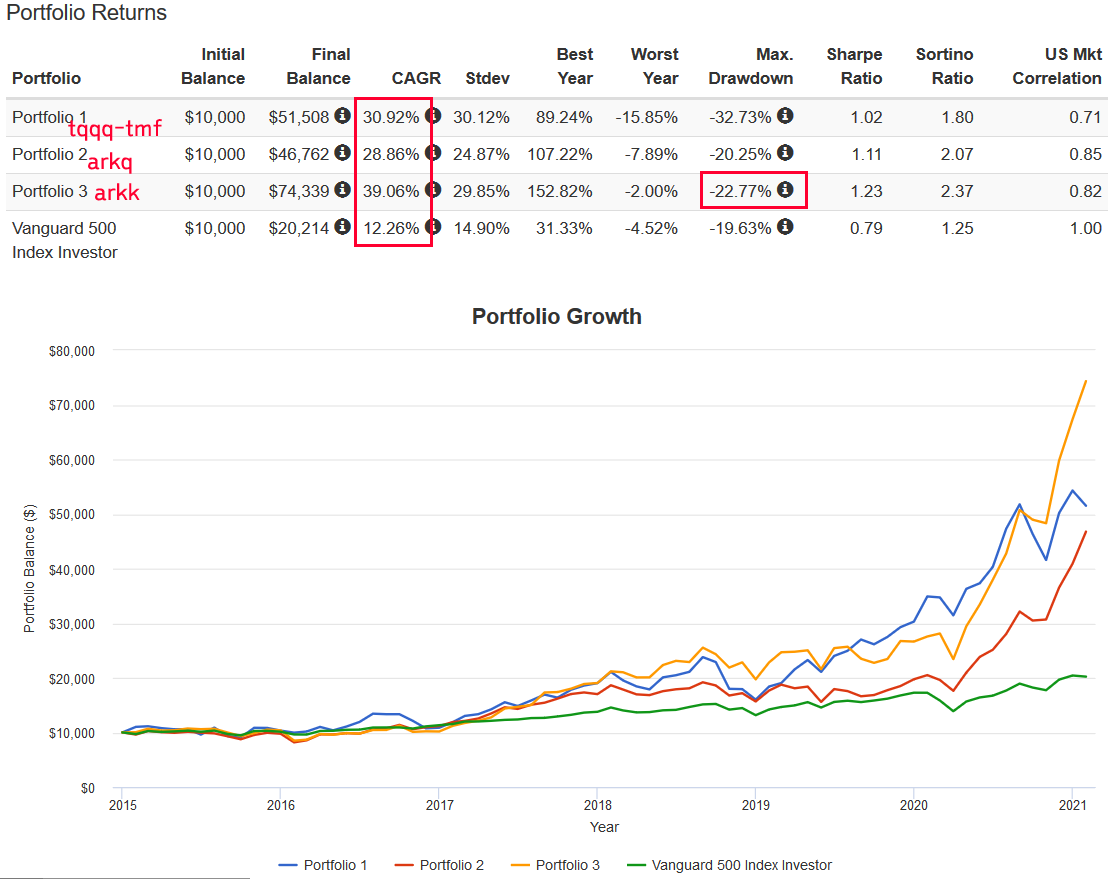 - 백테스트를 하던 도중, ARKK 의 MDD 가 TQQQ-TMF 보다 낮았습니다. (이것이 결정적인 이유입니다.)