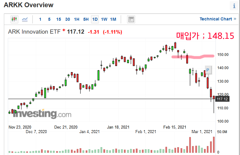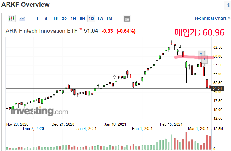 이번 하락장 초반에 ARKK 와 ARKF를 매입했습니다.